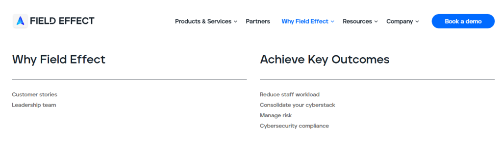 The image below highlights how Field Effect frames its messaging around business outcomes rather than technical features. By focusing on results like reducing staff workload and consolidating the cyber stack, the company makes complex cybersecurity solutions more tangible and relevant for business decision makers.
